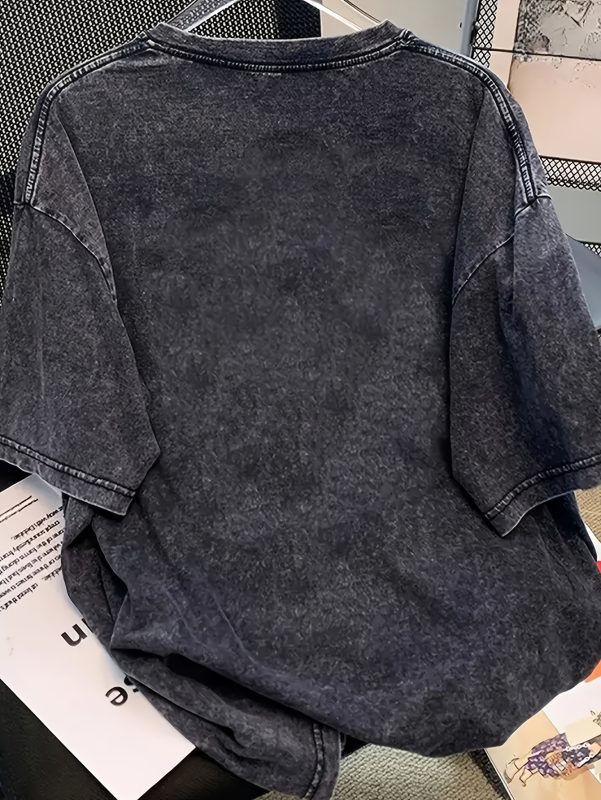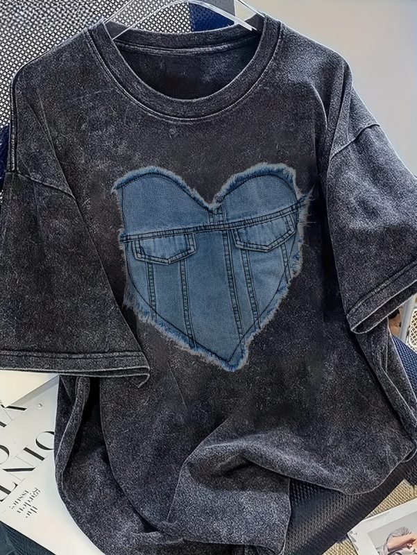 Washed Cotton Short Sleeved SLOY Summer Casual Short Sleeved Heart-Shaped Printed T-Shirt, Imitation Old Black Round Neck Top, Lightweight And Breathable Suitable for Casual Wear