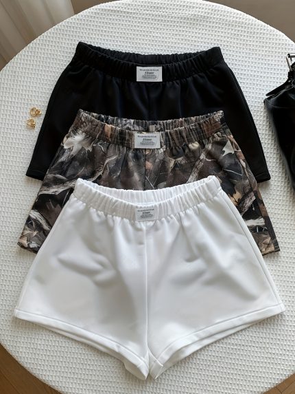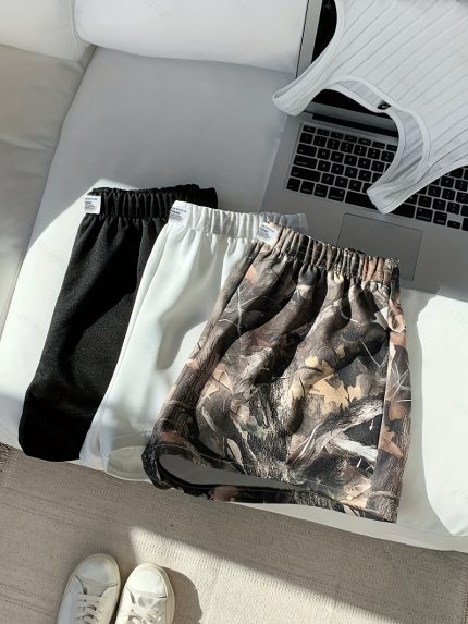 3pcs Women’S High-Waist Elastic Shorts – Black, White, and Camo Print, Casual Stretchy Drawstring Shorts for All Seasons, High Waisted Shorts