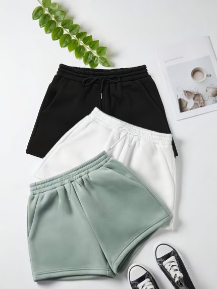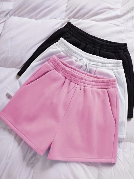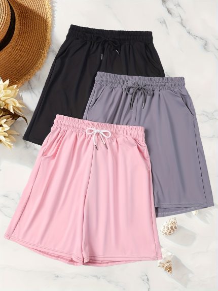 3pcs Women’s Lightweight High-Elasticity Drawstring Shorts with Front Pockets – Loose-Fit Casual Shorts for, Workouts & Summer, Machine Washable, Blacku002FGreyu002FPink, Shorts, Summer, Solid Color Design, Highelasticity Fabric