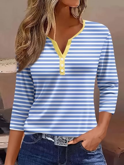 Women’s Long Sleeve T-Shirt – Button-Front Plaid-like Horizontal Stripes in Blue &, Non-Transparent Casual Everyday & Formal Tops for All Seasons, Ladies T Shirts, Allseason Apparel, Vneck Shirt, Soft Fabric