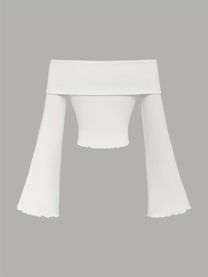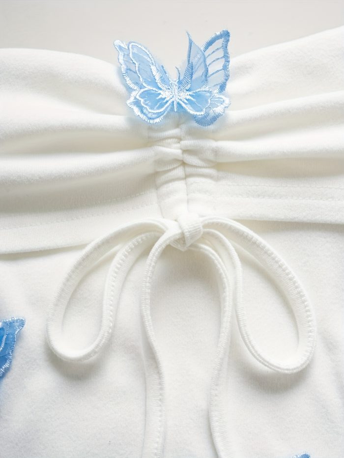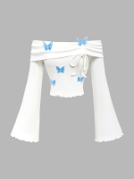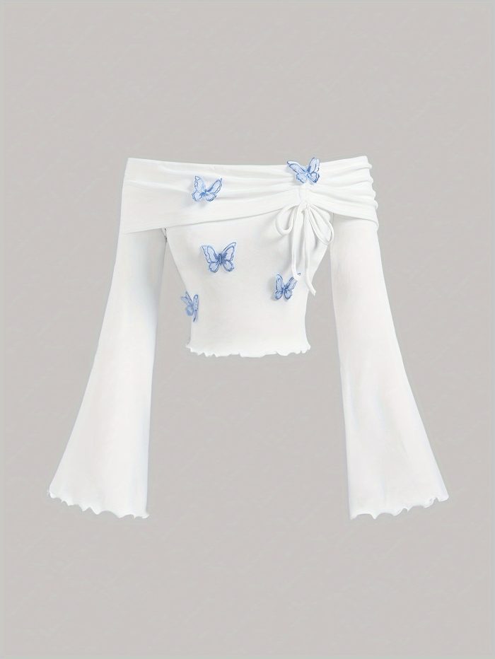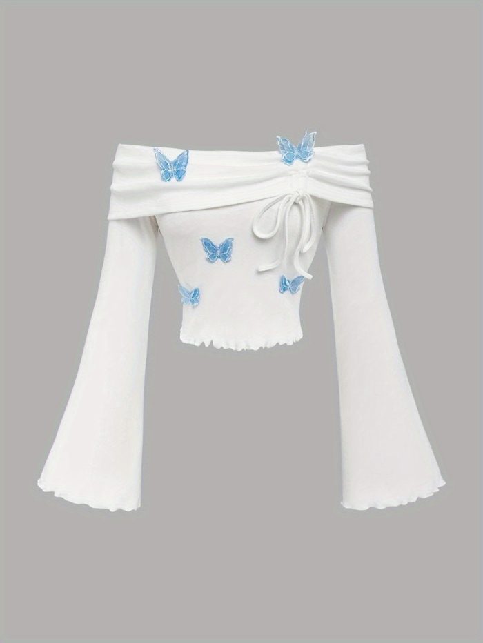 1pc White Polyester Knit Off-Shoulder Flare Sleeve T-Shirt with Blue Butterfly Embellishments, Cute Ruffle Trim, Regular Length, All-Season Fashion Top