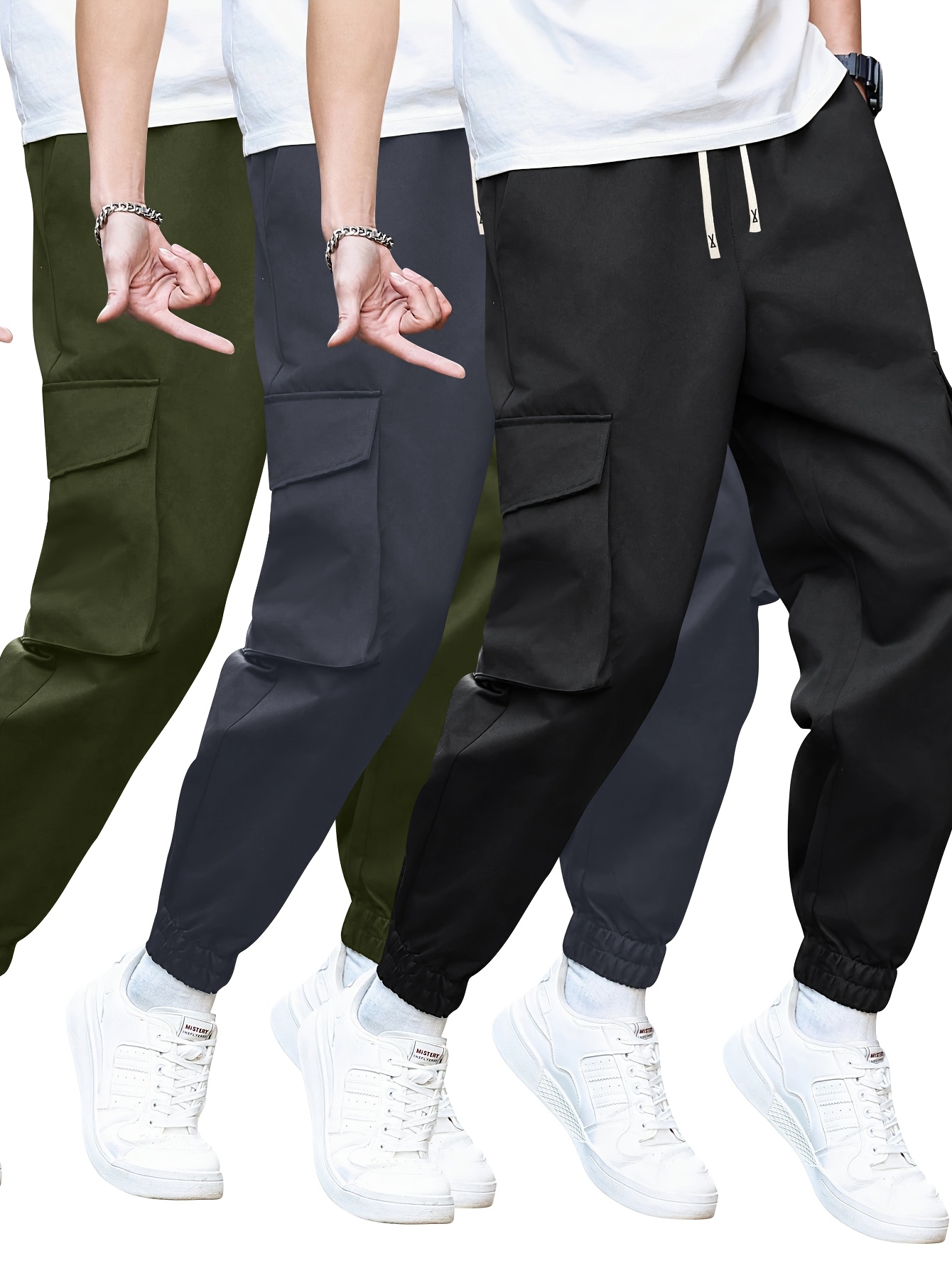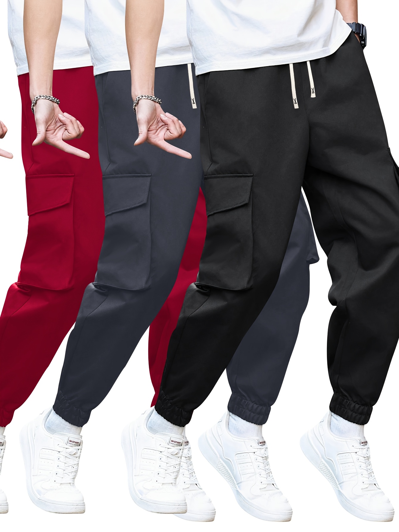3pcs Men’s Solid Color Cargo Pants with Multiple Pockets