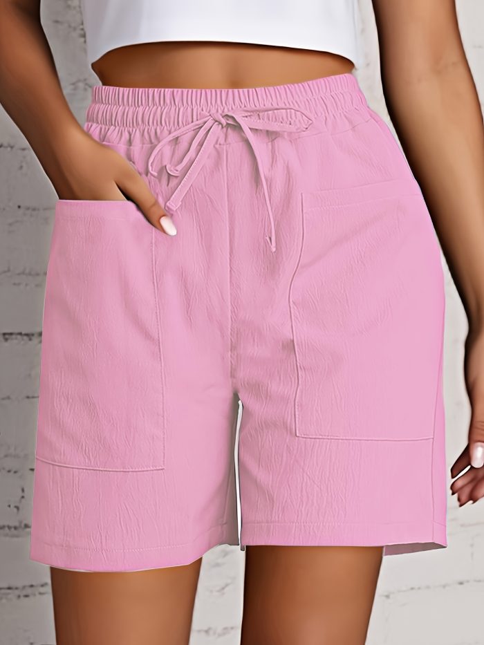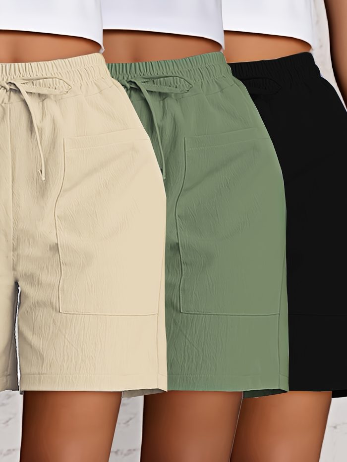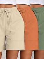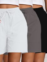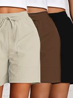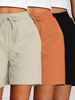 3pcs Women’S Summer Casual Straight-Leg High-Waisted Shorts – Solid Color, Faux Drawstring Detail, Polyester, Lightweight & Breathable for Beach or Vacatio