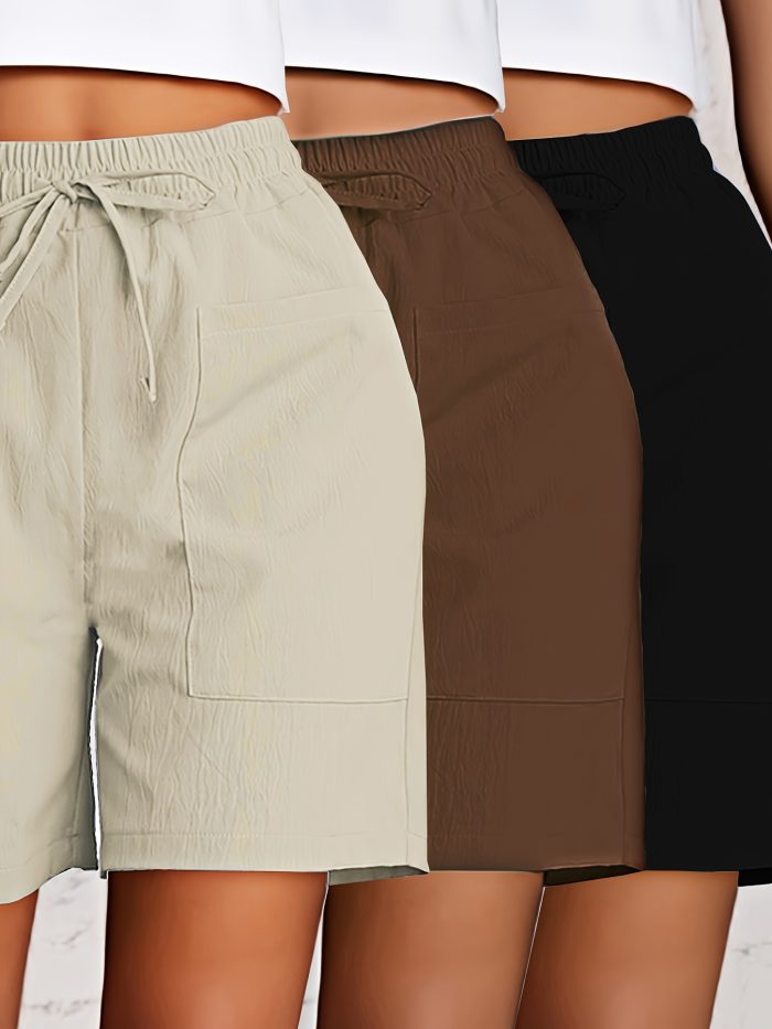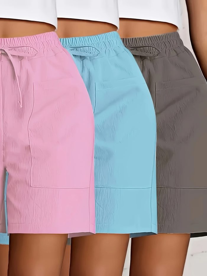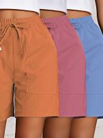 3pcs Women’s High-Waisted Straight-Leg Shorts – Summer Casual Elastic Waistband with Faux Drawstring, Solid Color Machine-Washable Non-Stretch Fabric for Casual Attire