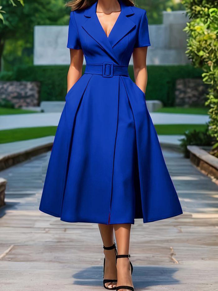 Elegant Dress Stylish Elegant Women’s Short Sleeve V-Neck Dress with Belt | A-Line Midi Dress, Solid Color, Perfect for Commuting & Casual Outings