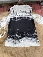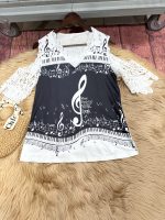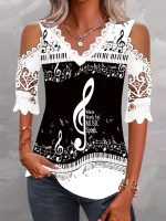 Home Women's T-Shirt Elegant | Lace High Stretch Polyester Women’s Elegant V-Neck Lace Sleeve T-Shirt | Music Note Print, Black & White Geometric Pattern | Perfect for Summer Vacations