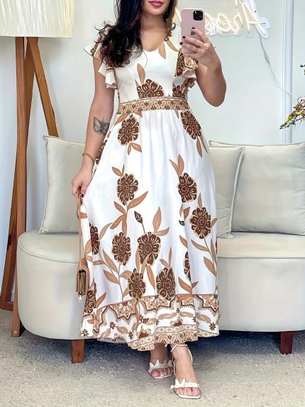 XWI Women’S Floral Print Mid-Length Dress with Removable Belt – Short Sleeve, Round Neck, Lightweight Polyester for Springu002FSummer Beach Vacations, Beach Dresses