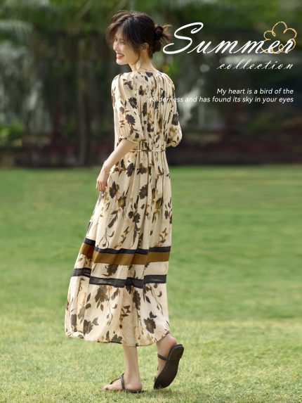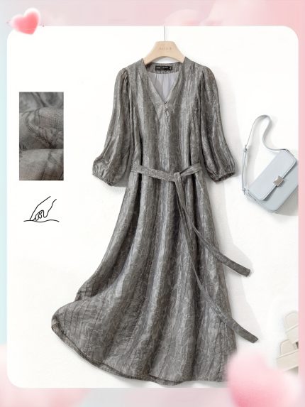 IHIMI Dress with Seven-Sleeve Elegant Wrinkle Texture Spring Collection Women’s Clothing