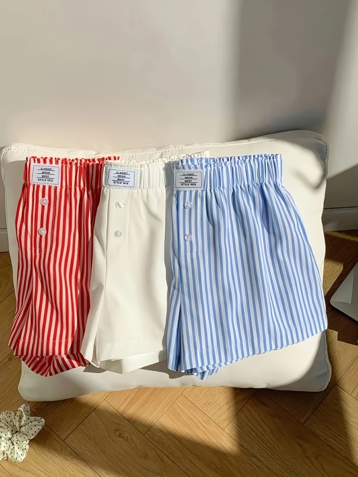 Elegant Striped Shorts 3-Pack Women’s Elastic Waist Shorts Set – Striped Checkered Solid Color, All-Season, Side Stripe Detail – 97% Polyester 3% Spandex, Woven Fabric, 150 gsm, Button Design