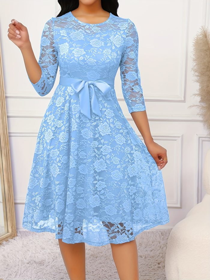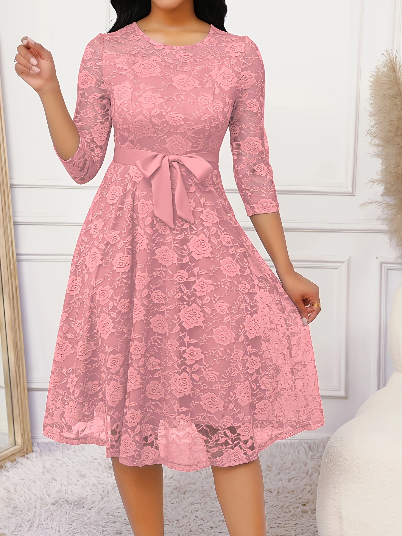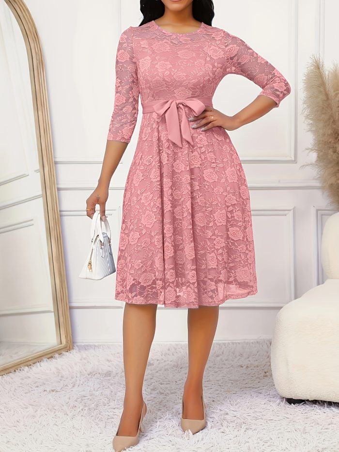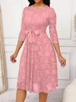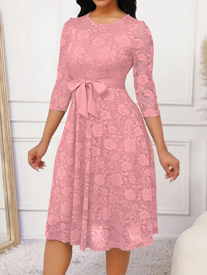Home Women's Dresses Elegant Women’S Dress Lace Round Collar Seven-minute Sleeve Lace Slim Pink Dress GNLBT178-1