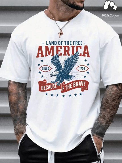 Men’s Patriotic American Flag Graphic T-Shirt – 100% Cotton 1776 Independence Day Design with Eagle & Stars, Bold Lettering Casual Streetwear, Regular Fit Short Sleeve Tee for Spring Summer Outdoor Hiphop Style, Everyday Comfort Wear