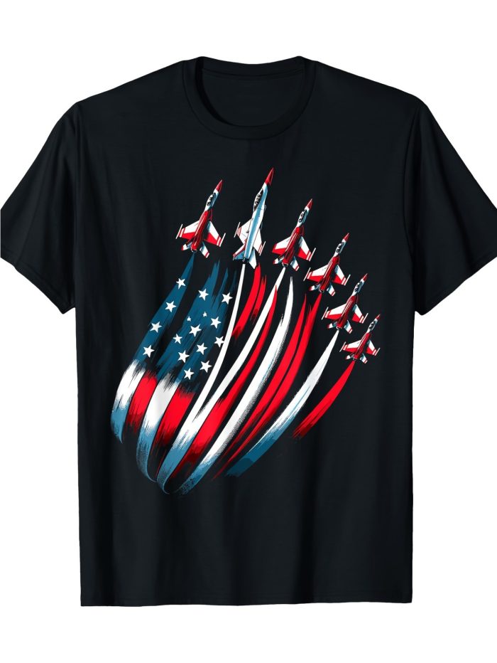 Men’S Patriotic USA Flag Fighter Jets 4th of July T-Shirt – 100% Cotton 180gsm Relaxed Fit Black Tee with Red White Blue Star-Spangled Banner & Fighter Jet Design, Machine Washable Casual Shirt for Independence Day Celebrations