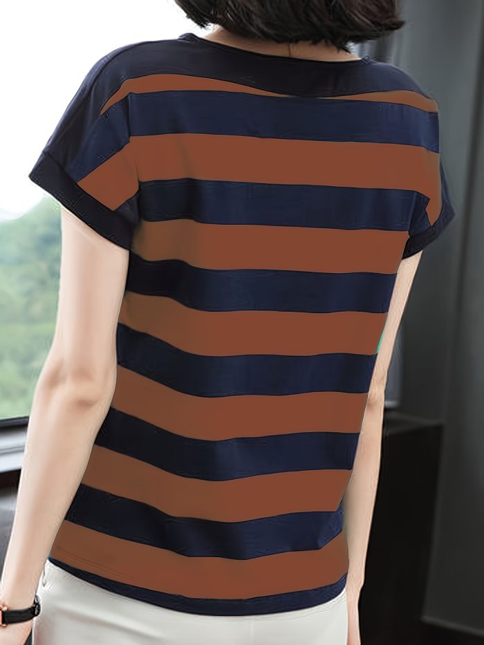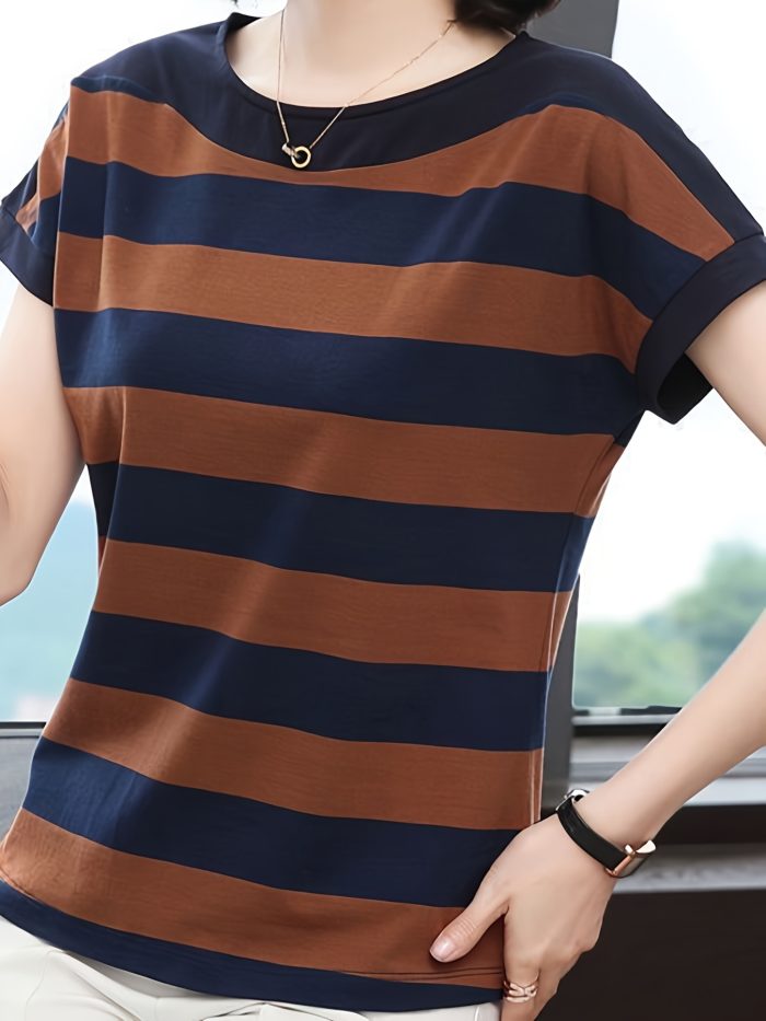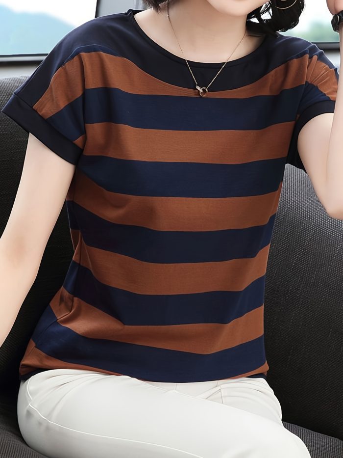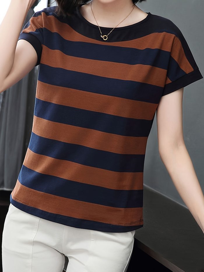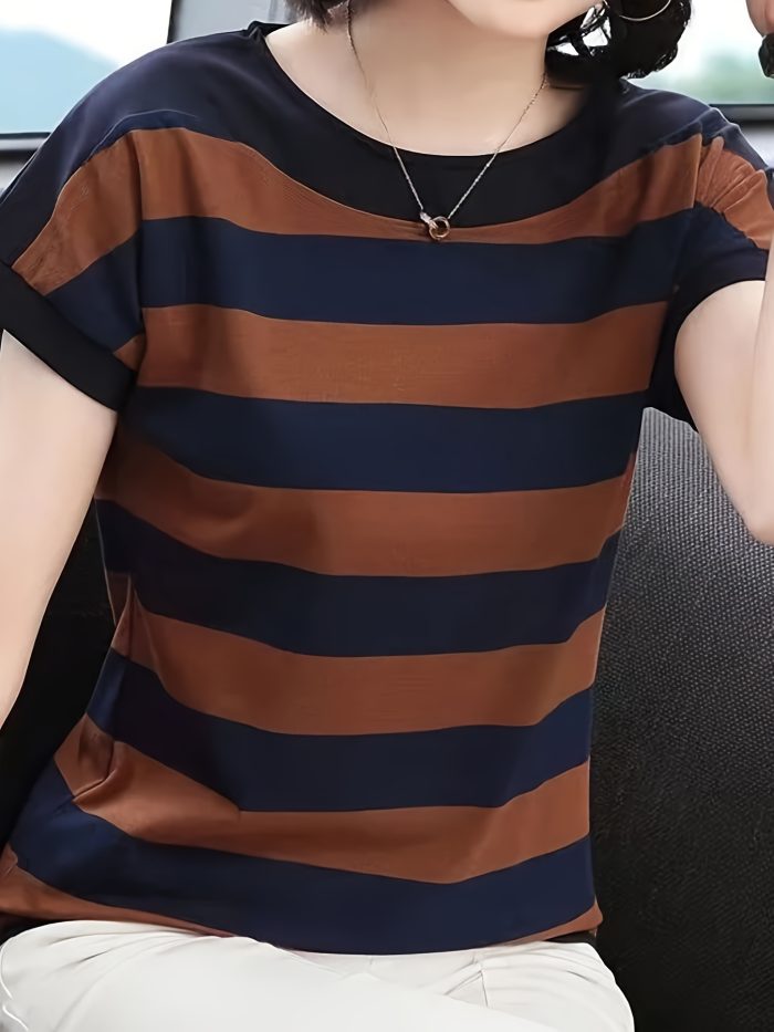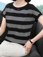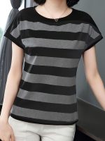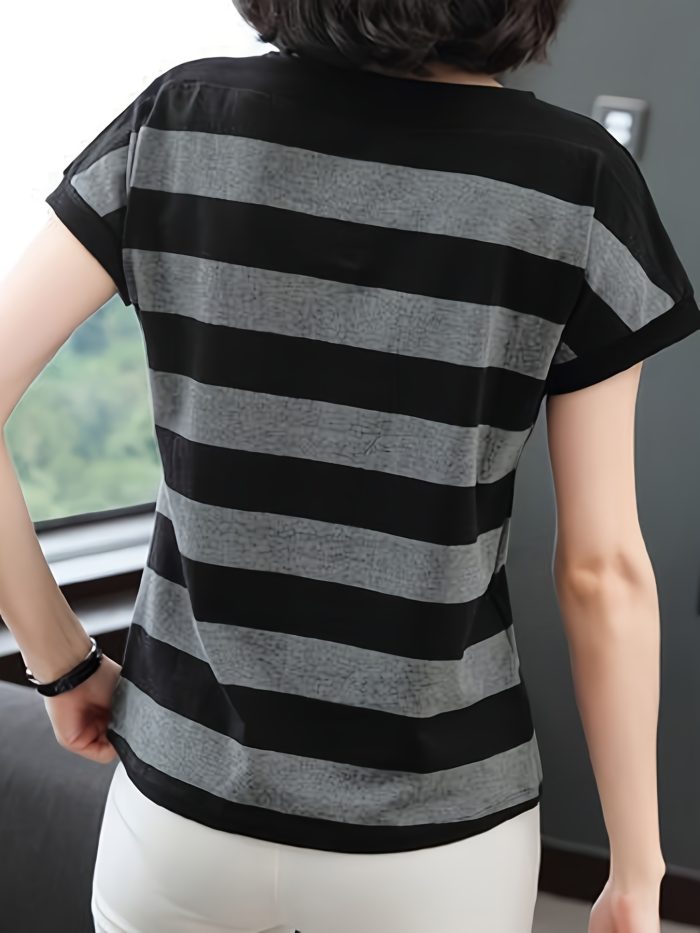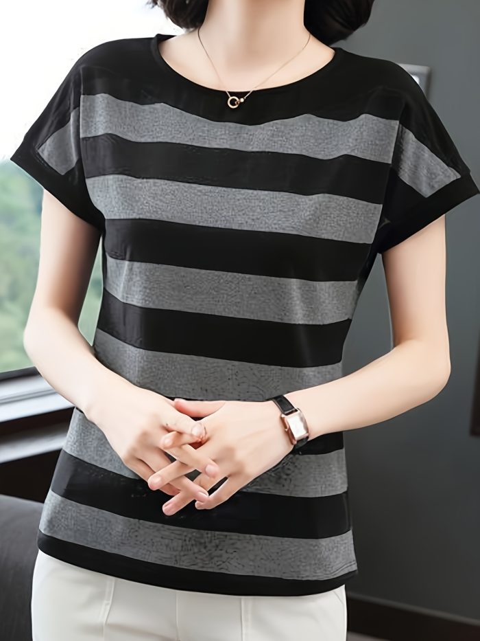 Home Women's T-Shirt Women’S Casual Striped Short Sleeve T-Shirt – Asymmetrical Hem, Crew Neck, Lightweight Polyester Blend, Black & Gray Vertical Stripes, Perfect for Casual Attire, Casual Wear Tee | Asymmetrical Hem Tee | Glossy Texture Shirt