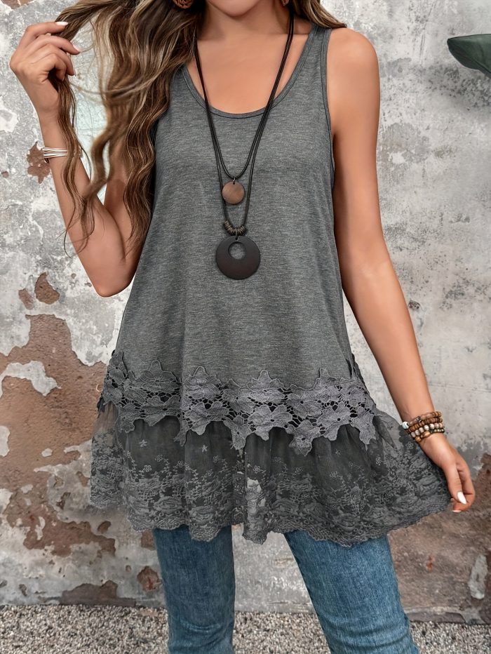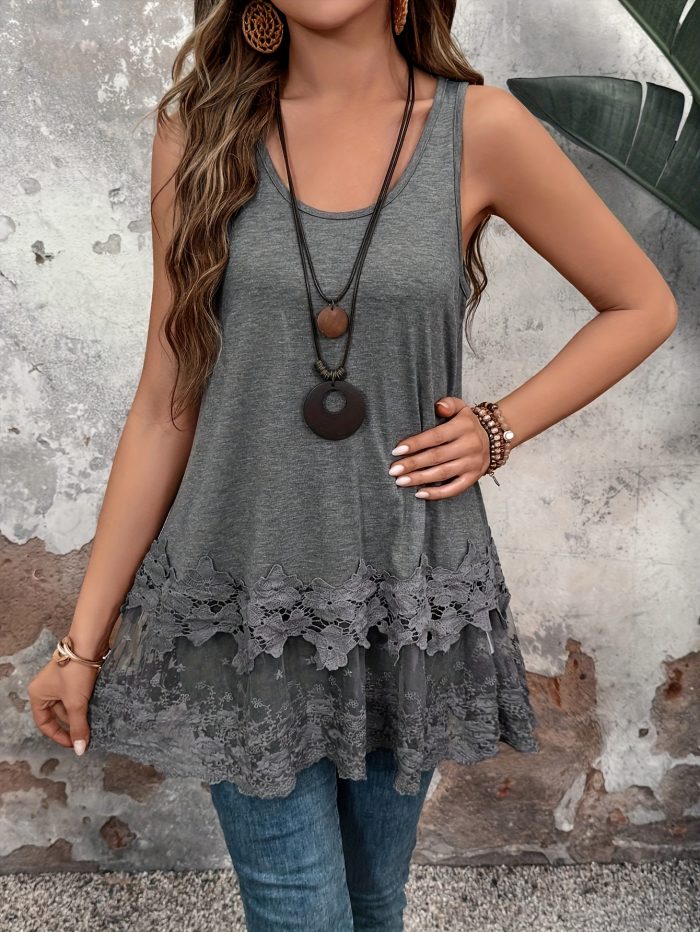 Women’S Casual Summer Tank Top with Contrast Lace Detail – Sleeveless, Round Neck, Black and White Ruffle Hem, Polyester Fabric, Perfect for Casual Attire, Summer Tank Tops