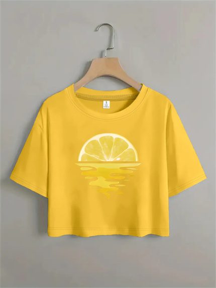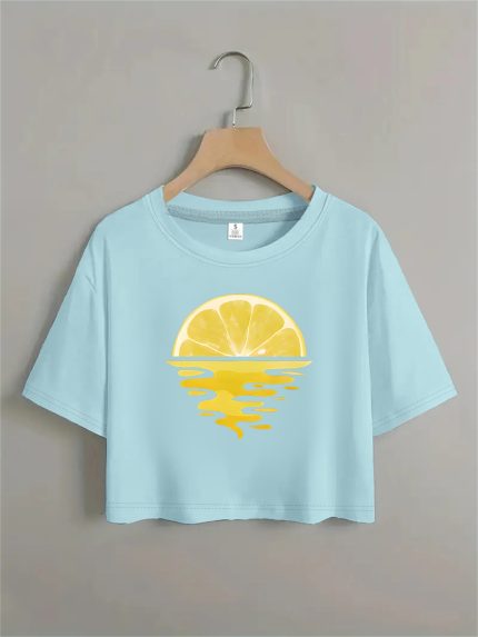 Women’s Y2K Style Cropped T-Shirt – Light Blue Lemon Sunset Graphic Print, Soft Breathable Fabric, Machine Washable, Springu002FSummer Casual Top, Summer Clothing, Short Sleeve Tee, Asian Fabric Care
