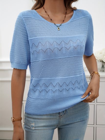 ZAFUL Women’s Sexy Semi-Sheer Geometric Cable T-Shirt – Lightweight Petal Edge Short Sleeve Round Neck Top for Springu002FSummer, Machine Washable, Summer Fashion, Crochet Texture, Delicate Design