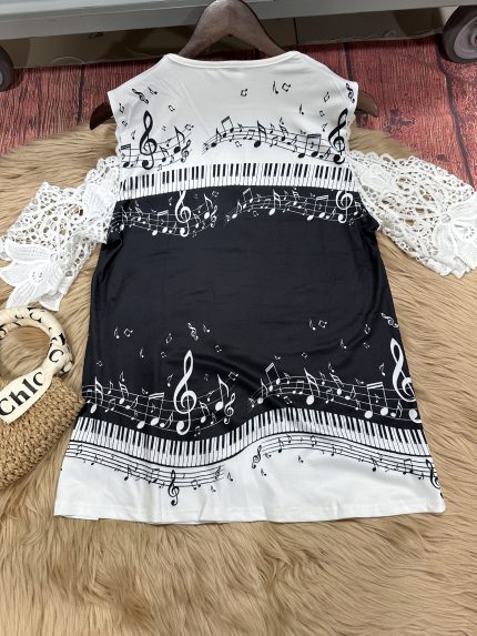 Elegant | Lace High Stretch Polyester Women’s Elegant V-Neck Lace Sleeve T-Shirt | Music Note Print, Black & White Geometric Pattern | Perfect for Summer Vacations