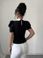 Be the first to review “Women’s Elegant Black & White Contrast Pearl-Adorned Collar T-Shirt – Short Sleeve Summer Top with Flared Cuff Sleeves, Machine Washable Regular Fit Casual Shirt, Ladies T Shirts” Cancel reply