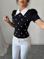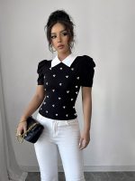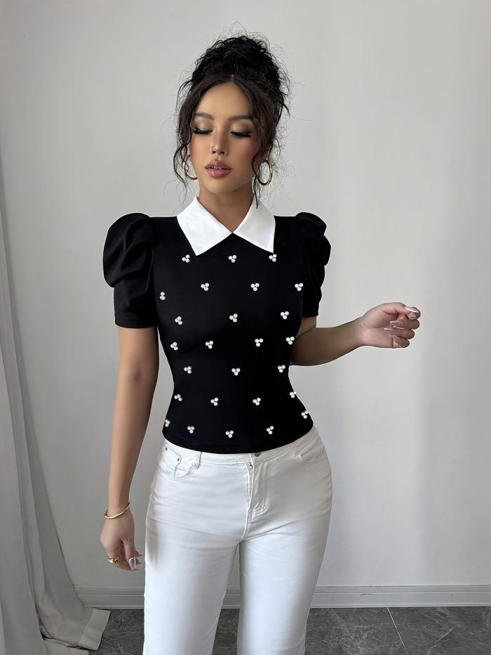 Home Women's T-Shirt Women’s Elegant Black & White Contrast Pearl-Adorned Collar T-Shirt – Short Sleeve Summer Top with Flared Cuff Sleeves, Machine Washable Regular Fit Casual Shirt, Ladies T Shirts