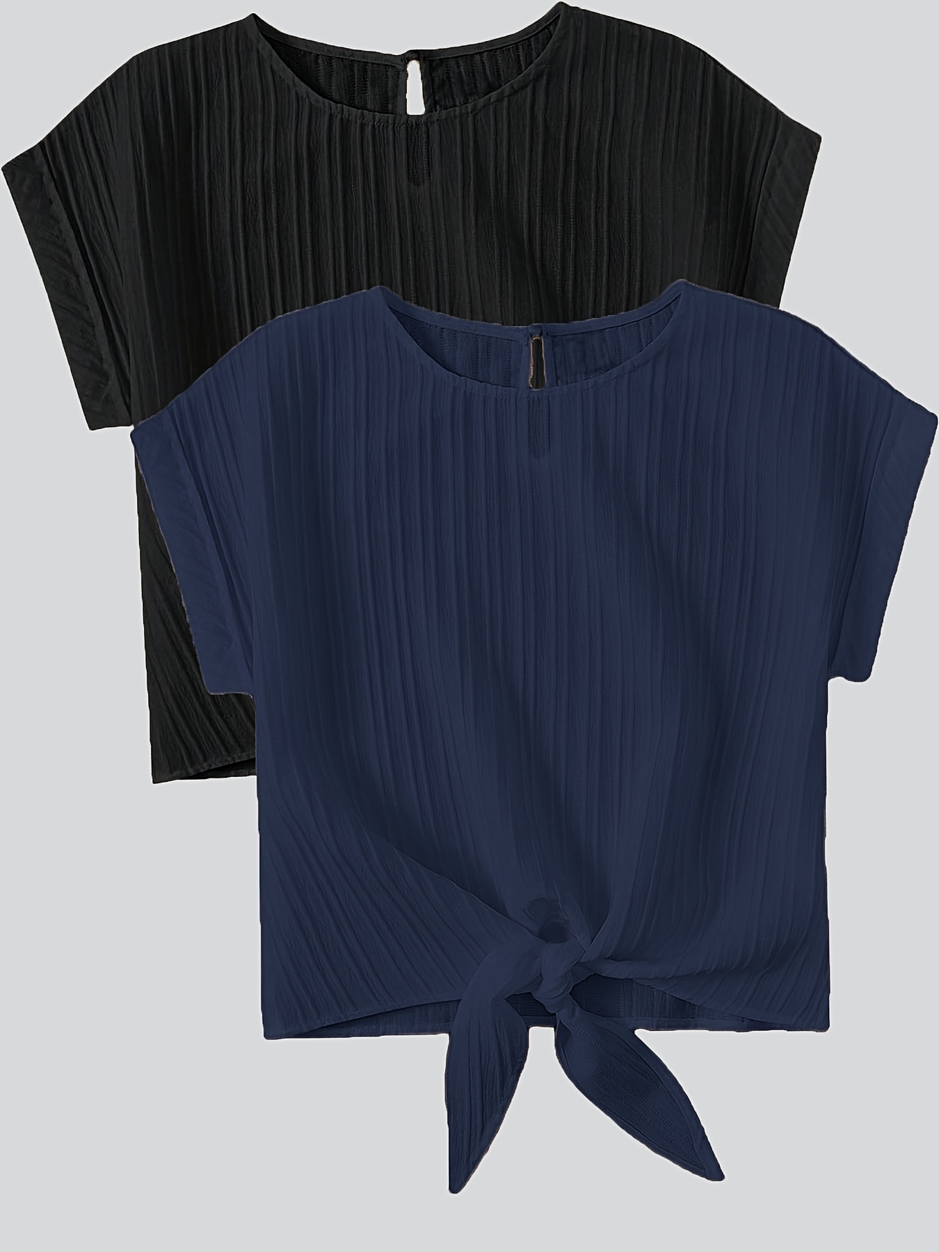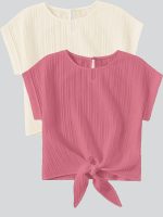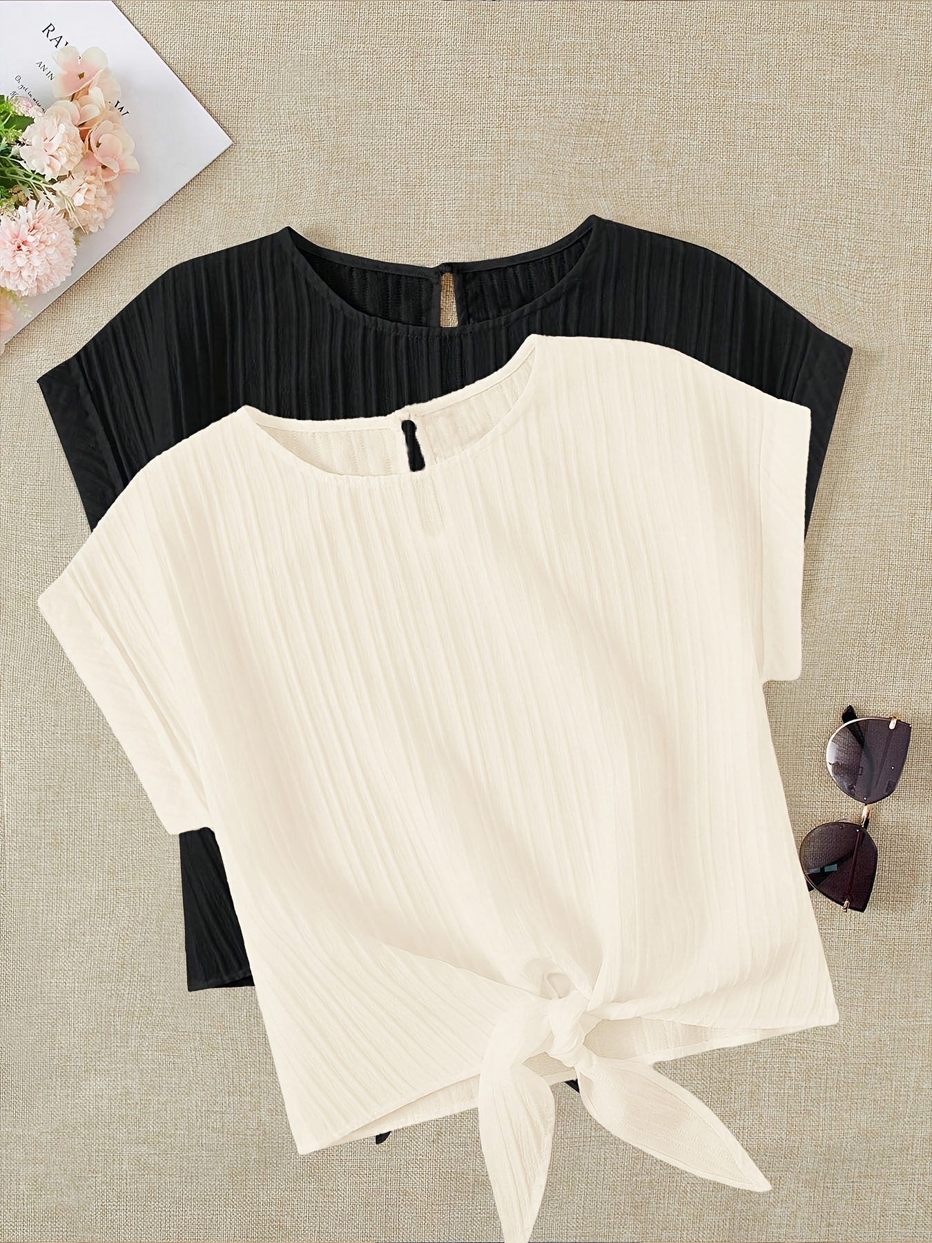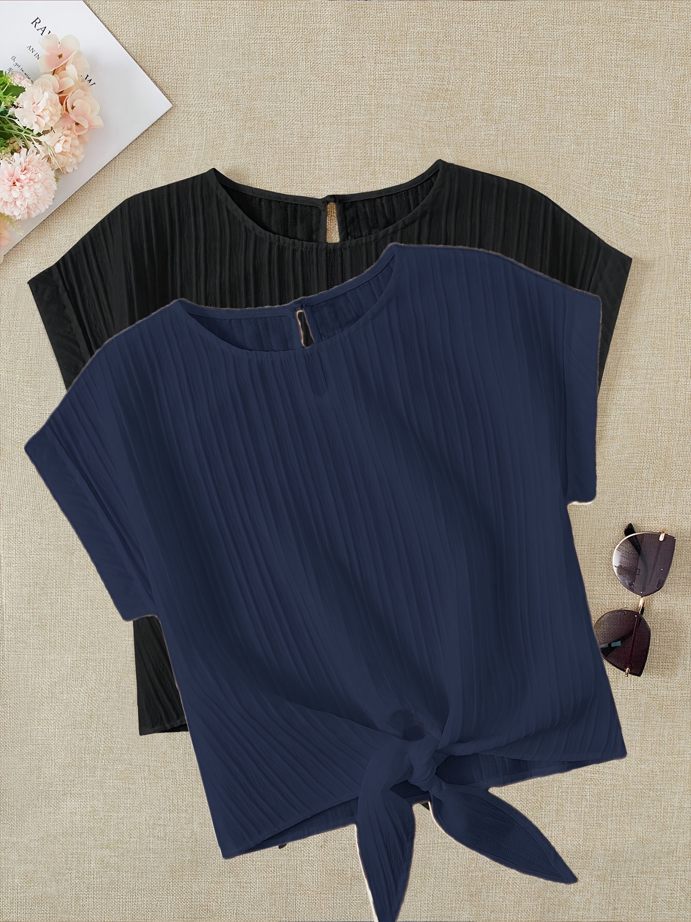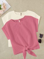 Home Women's T-Shirt Women’S Elegant Red Ruched Short Sleeve Top with Tie-Front Detail – Lightweight Polyester, Springu002FSummer Casual Wear, Perfect for Beach or Vacation Outfits, Beachwear Top | Ruched Texture Top | Polyester Fabric