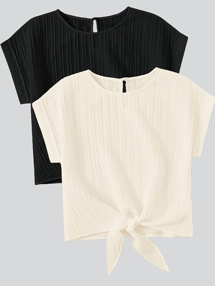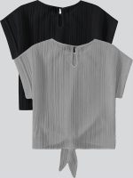 3pcs s’ Pleated Round Neck Short Sleeve Bow Print Casual Versatile T-Shirt Top