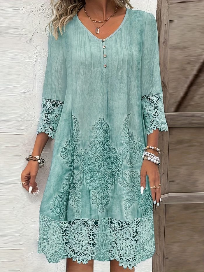 Home Women's Dresses Women’s Elegant V-Neck Lace Trim Dress – Casual Light Green Polyester Blend, All-Season Woven Shirt Dress with Floral Pattern, Perfect for Casual Attire
