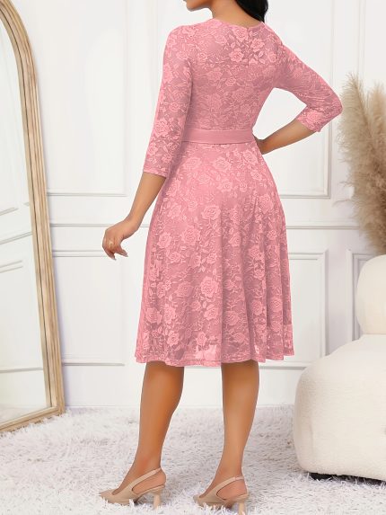 Elegant Women’S Dress Lace Round Collar Seven-minute Sleeve Lace Slim Pink Dress GNLBT178-1