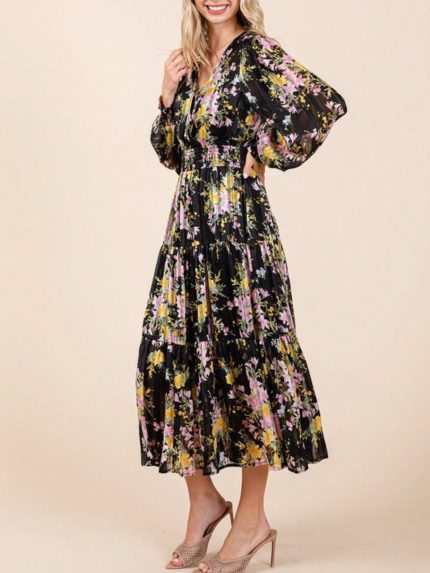 Womens Casual Floral Boho Chic Ruffle Sleeve Wrap Maxi Dress Black Yellow Pink Blossom Print Three Quarter Length Sleeve V Neck Elastic Waist Flowing Tiered Skirt Spring Summer Party Beach Vacation