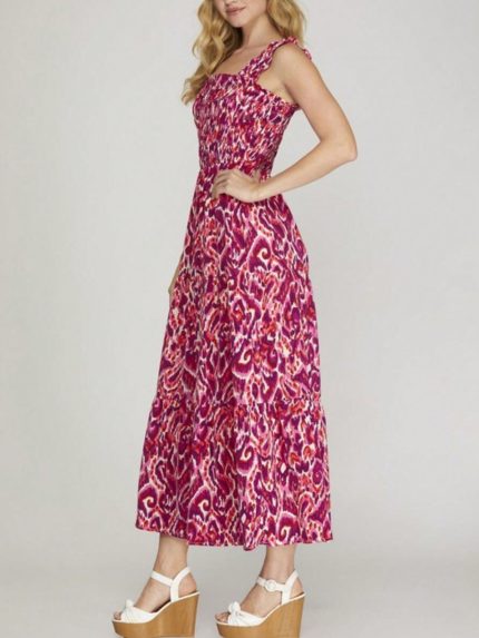Womens Casual Bohemian Chic Ruffle Strap Abstract Print Smocked Maxi Dress Flowing Pink Purple Pattern Square Neck Sleeveless Full Length Lightweight Summer Beach Vacation Party
