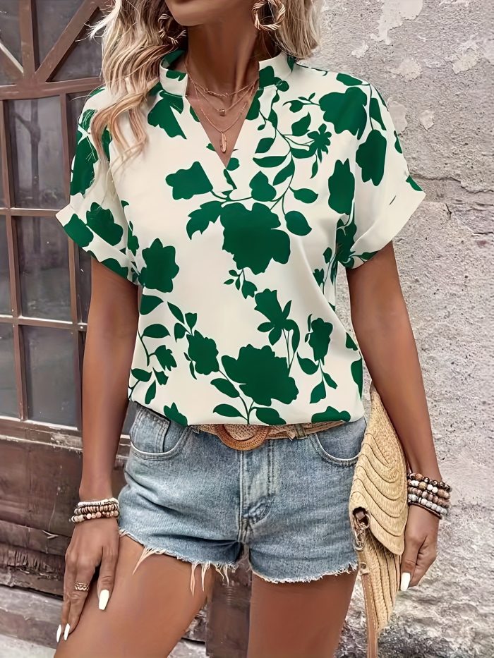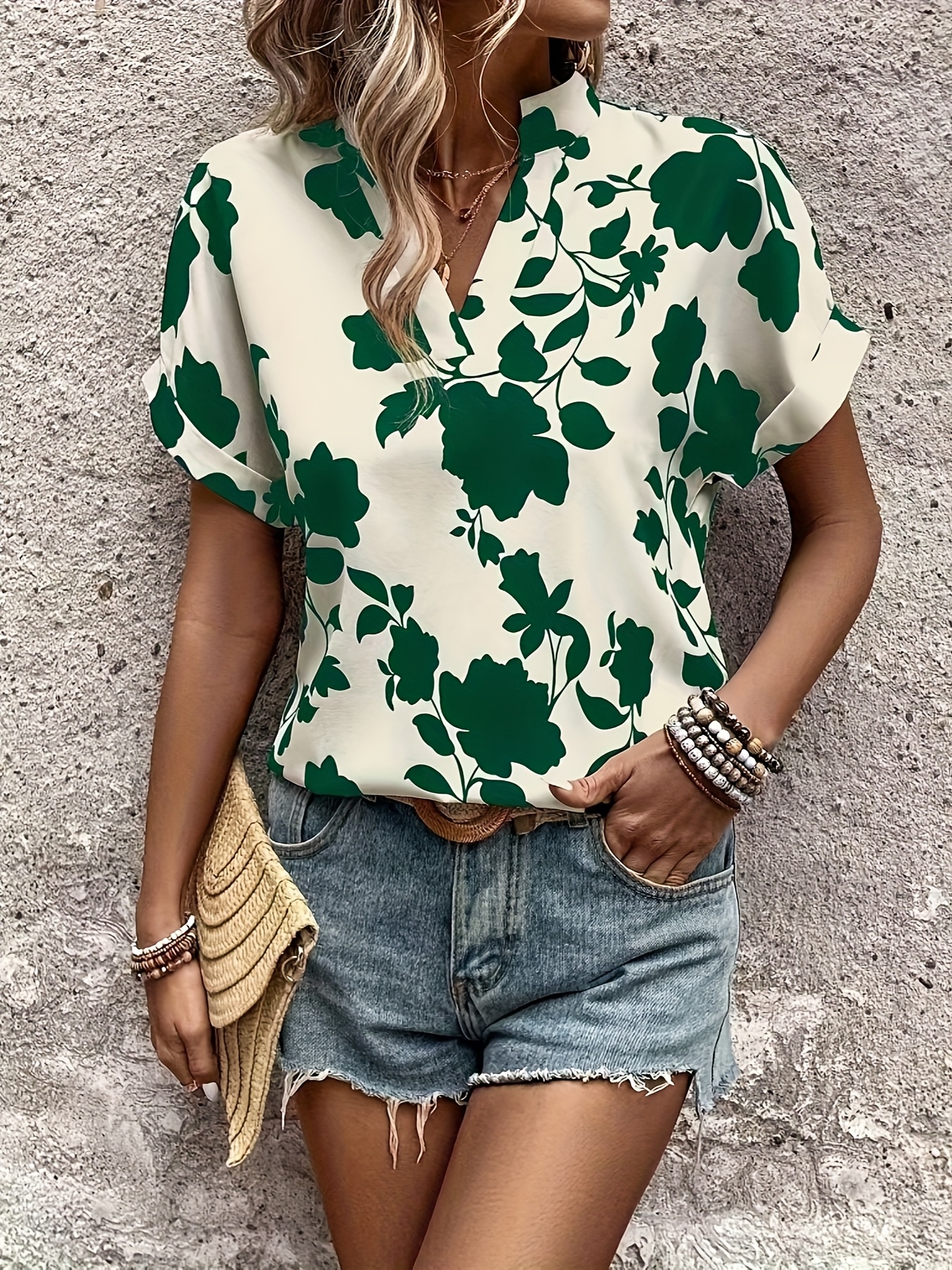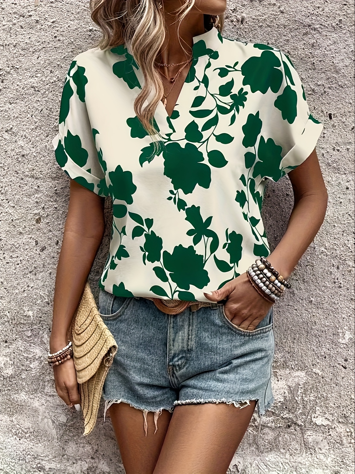 Women’S Floral Print V-Neck Short Sleeve T-Shirt – Casual Summer Top with Red & White Flower Design, Loose Fit, Medium Stretch, Perfect for Casual Attire, Floral Print Blouse