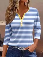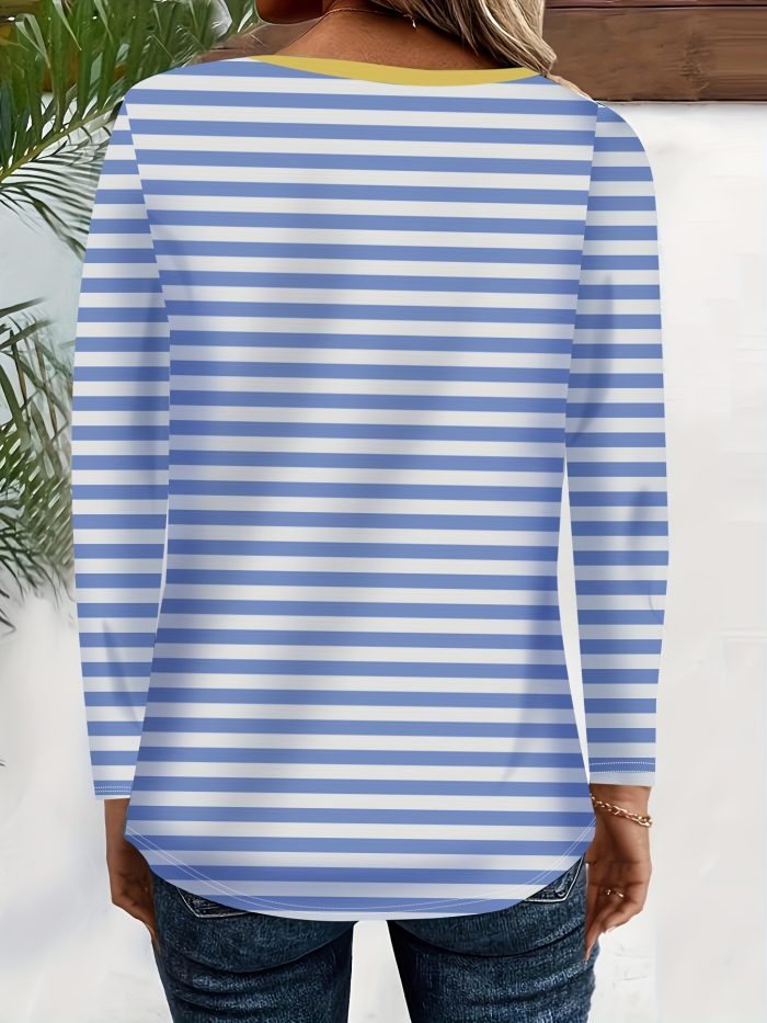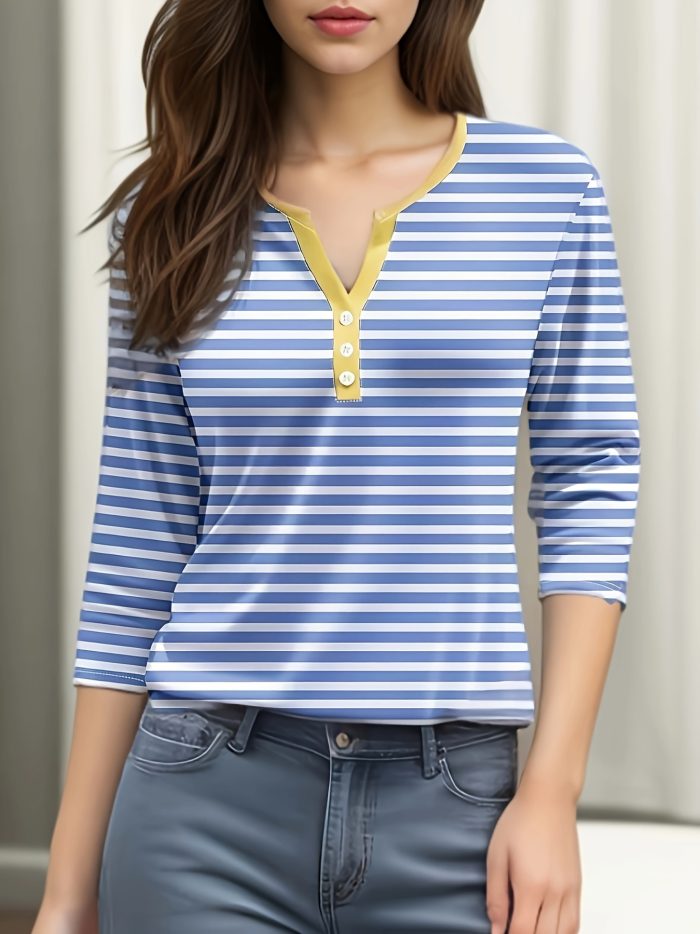 Women’s Long Sleeve T-Shirt – Button-Front Plaid-like Horizontal Stripes in Blue &, Non-Transparent Casual Everyday & Formal Tops for All Seasons, Ladies T Shirts, Allseason Apparel, Vneck Shirt, Soft Fabric