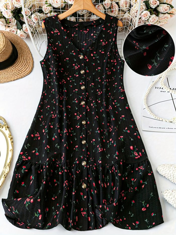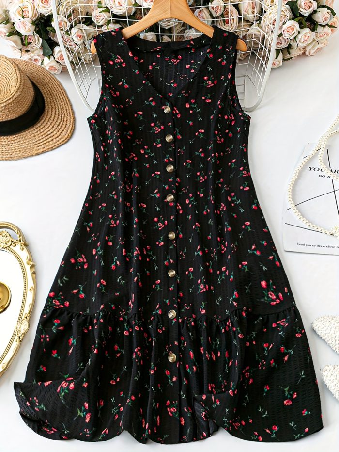 Be the first to review “Women’s Sleeveless V-Neck A-Line Dress with Ruffle Hem & Front Buttons – Black & Pink Floral Print Patchwork Design, Machine Washable Casual to Dressy All-Season Wear, Button Up Dress, Casual Wear, Vneck Design, Nontransparent Fabric” Cancel reply