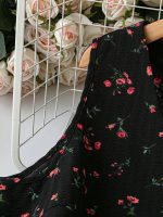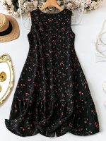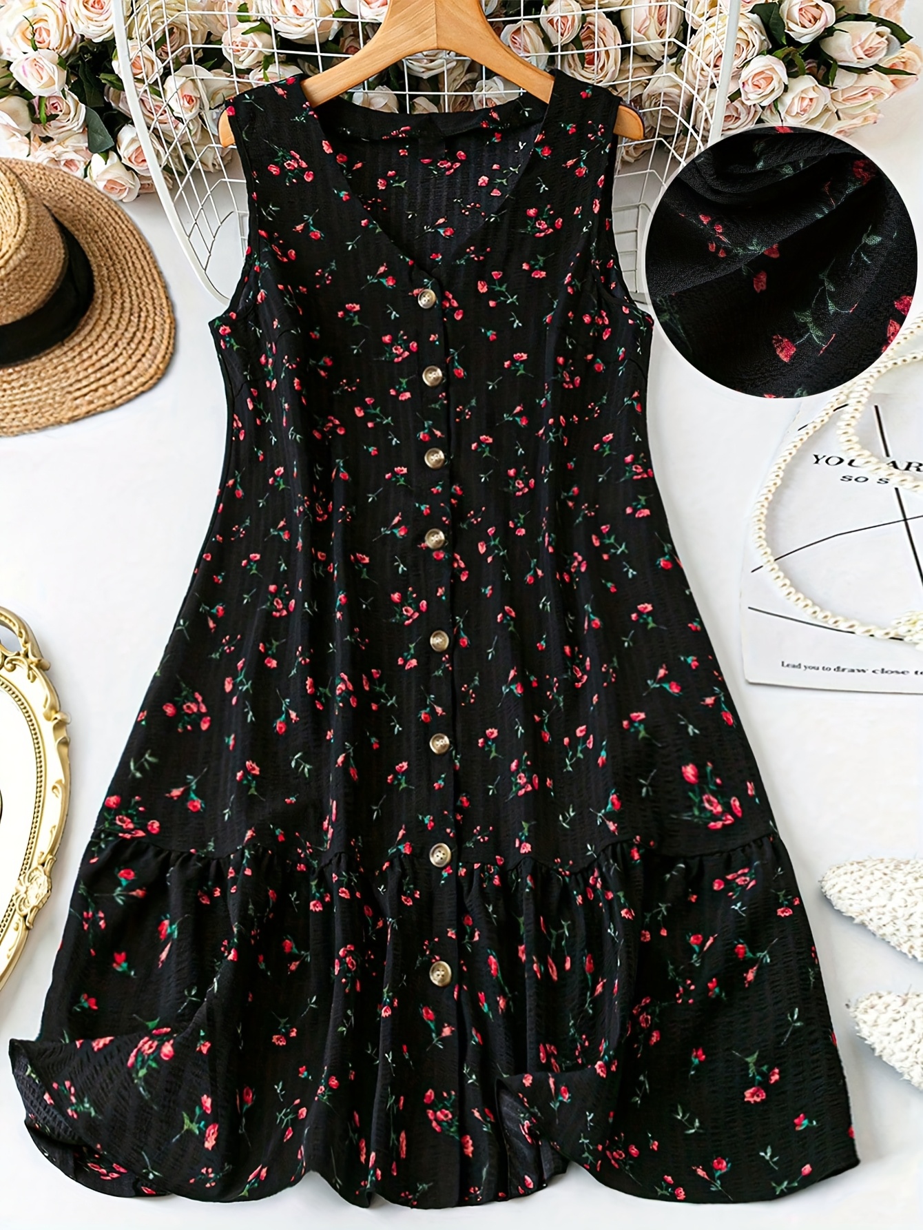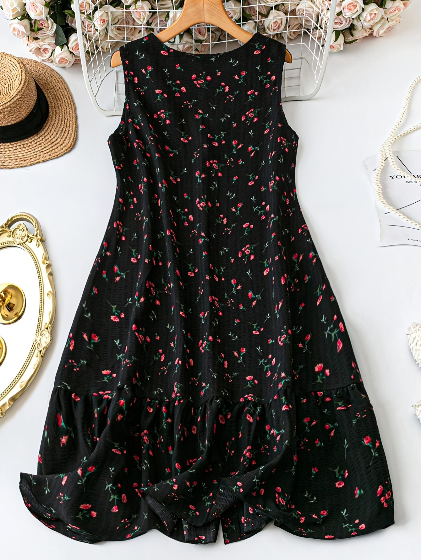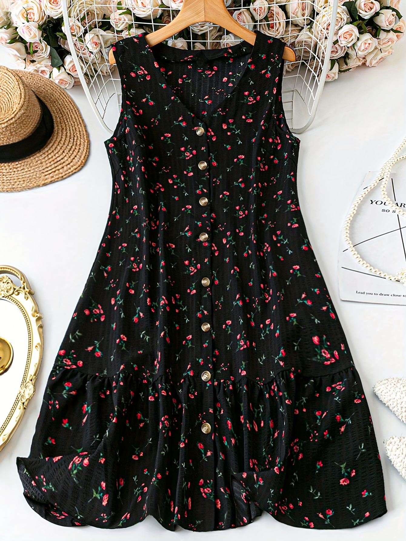 Women’s V-Neck Sleeveless A-Line Dress with Ruffled Hem & Front Button Closure – Striped Decal Print, Black with Red Floral Patchwork, Machine Washable Casual to Dressy All-Season Dress, Versatile Fashion, Structured Design, Nontransparent Fabric